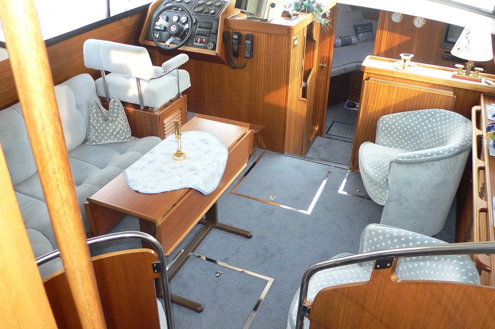 Inredning i mahogny och teak på fördäck, skarndäck, akterdäck samt flybridge.