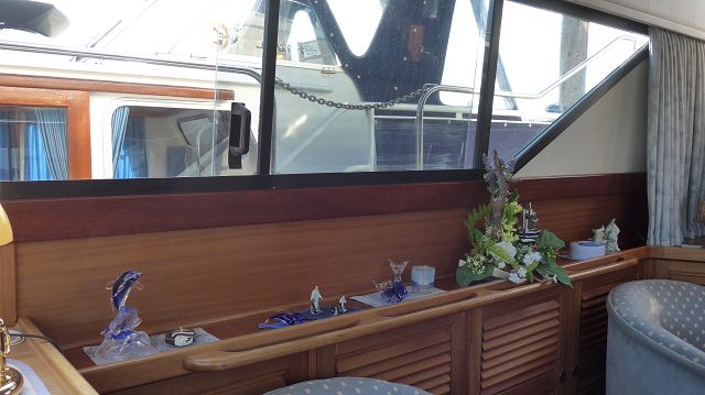 • Akterdäck med bord, vikstolar och sittkuddar för ryggstöd
