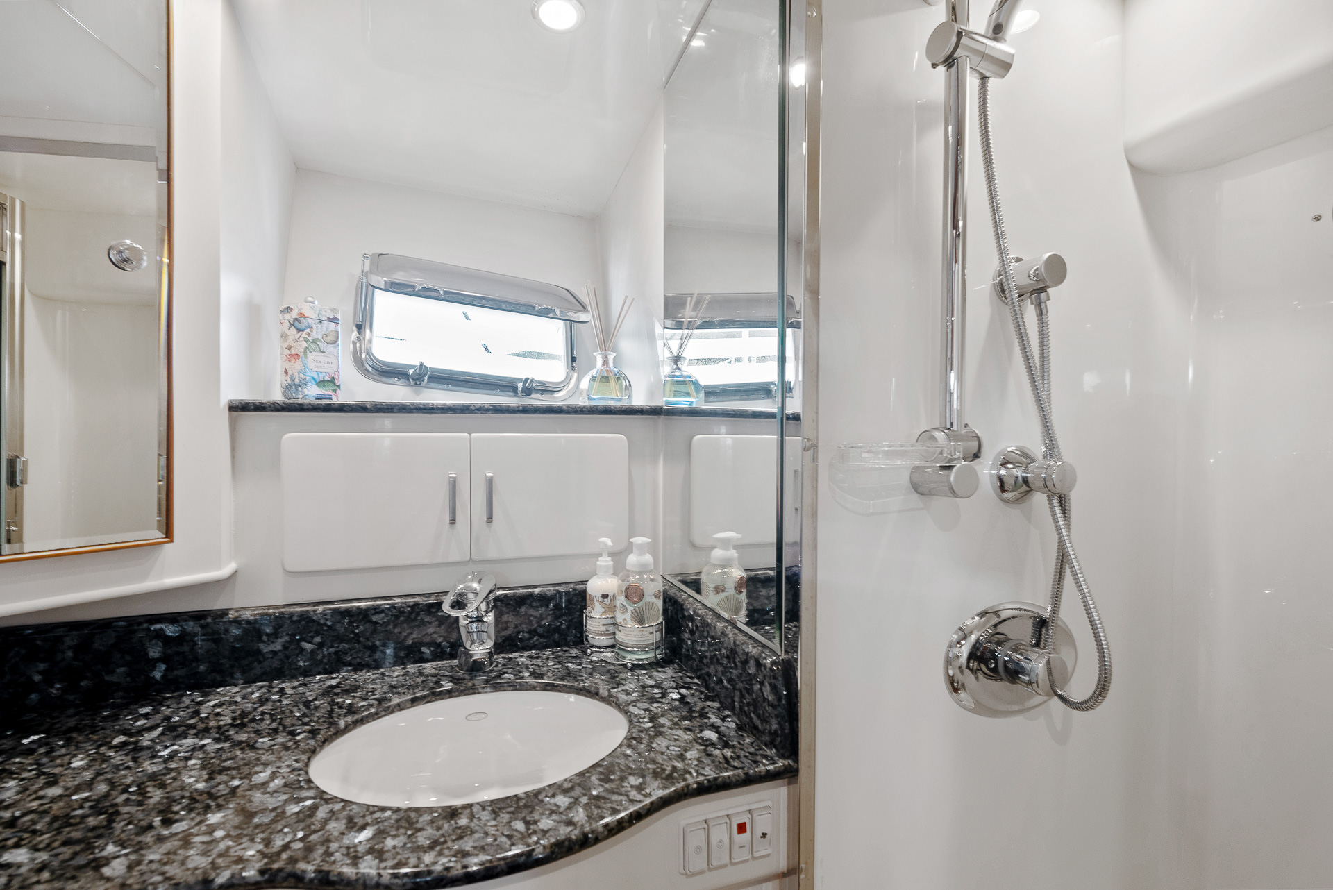 •Master cabin forward with en suite shower/ Heads with Blue Pearl granite, 2 x hanging lockers, custom sprung mattress with Ultrasuede ‘Periwinkle 2323′ headboard , additional teak on cabin bulkheads