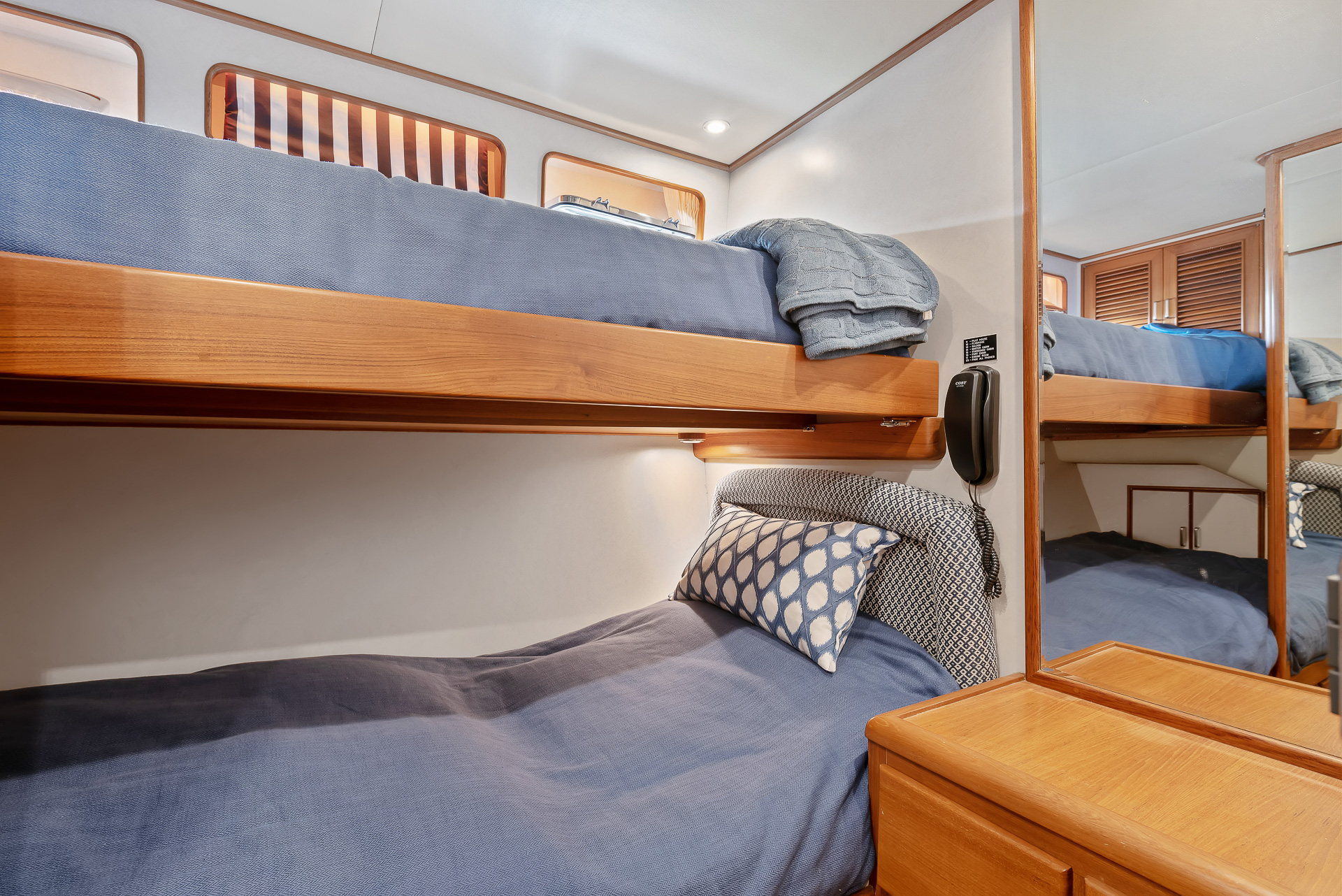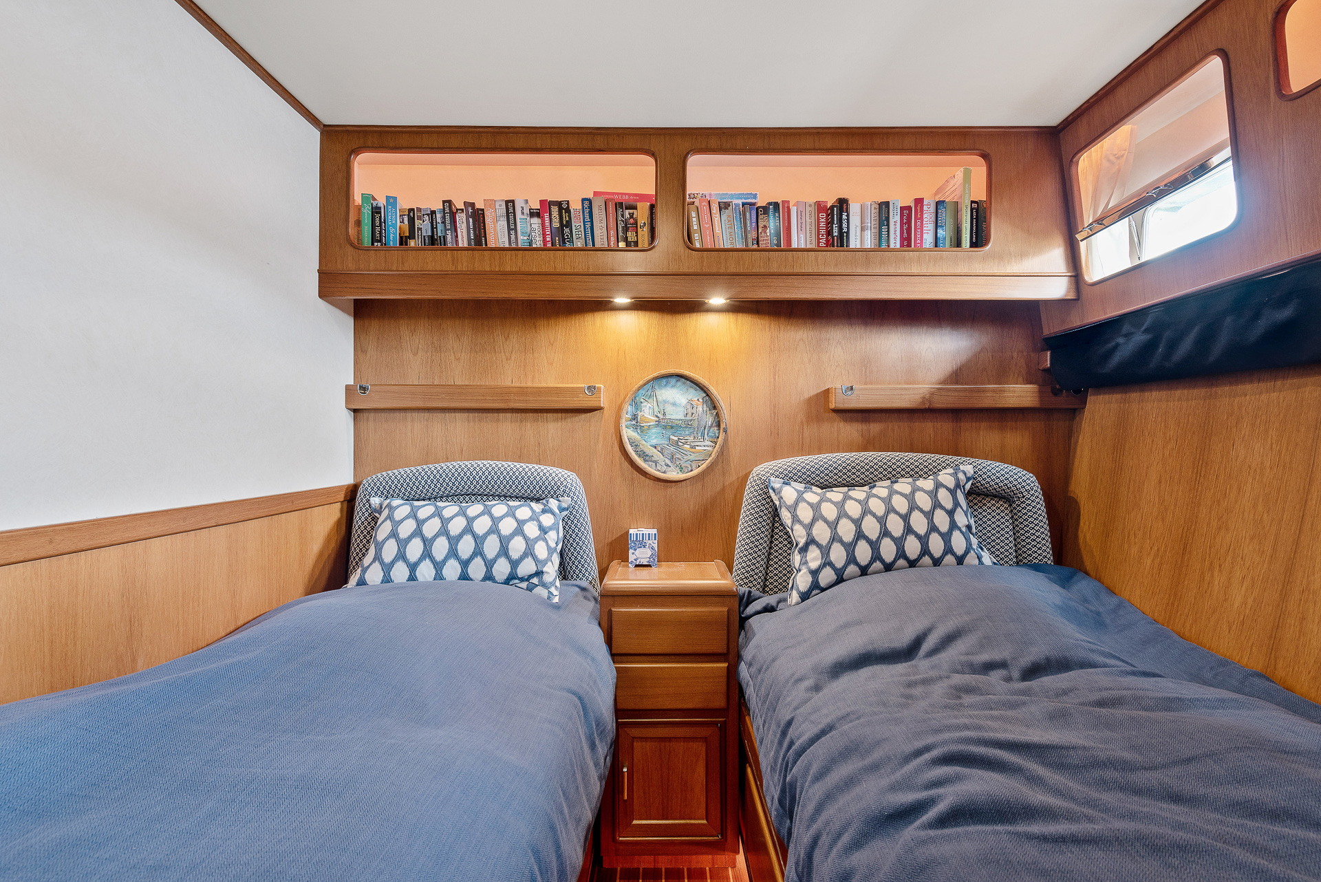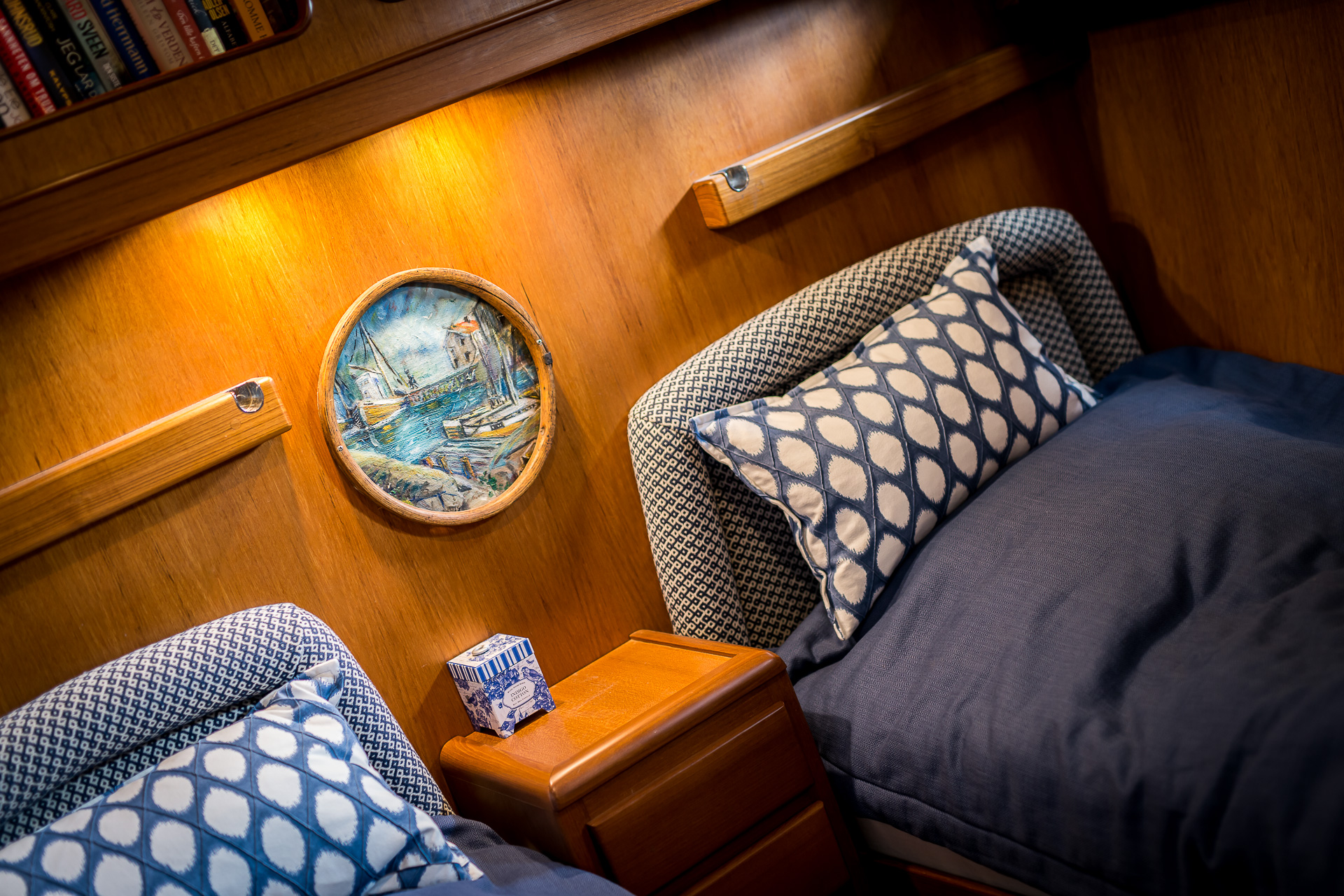 •Port cabin with twin berths, custom sprung mattresses and Ultrasuede ‘Periwinkle 2323′ headboards, hanging locker and additional teak on outboard bulkhead. The port twin berths are convertible to a double berth