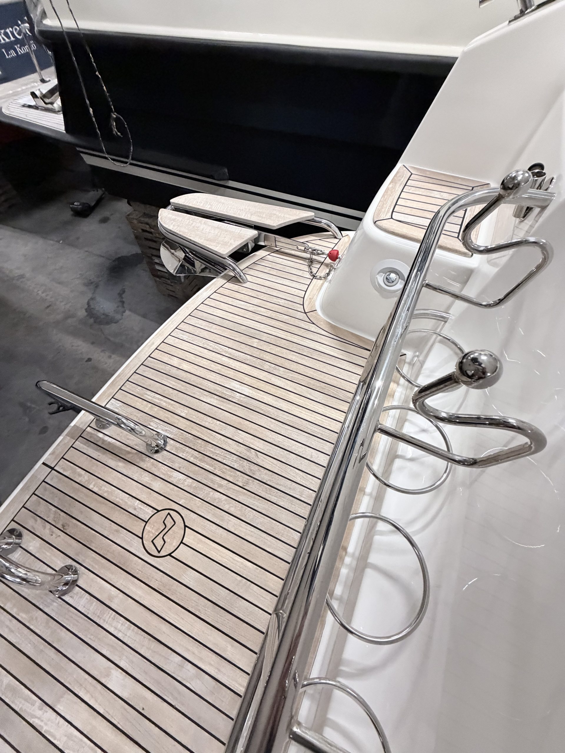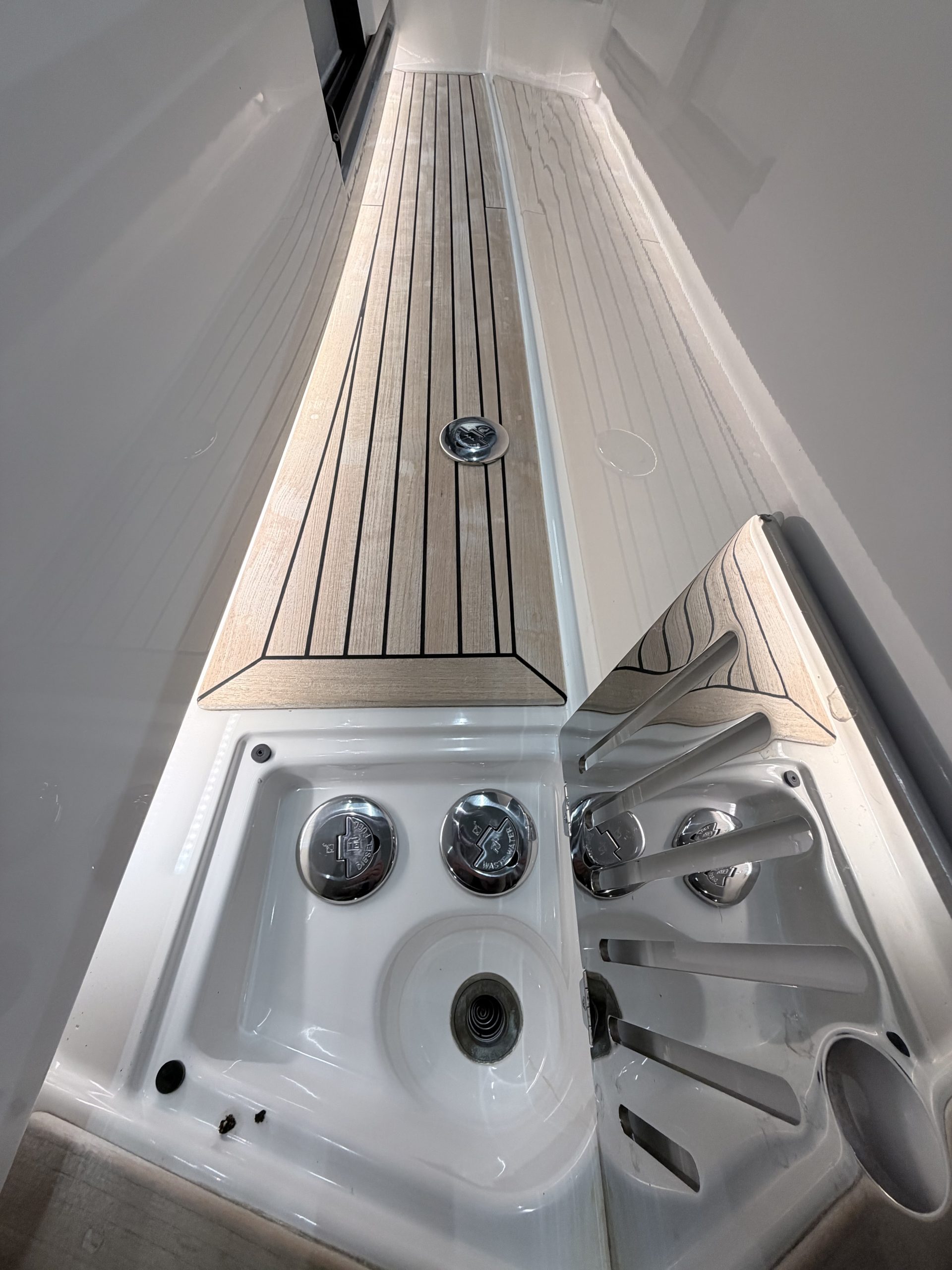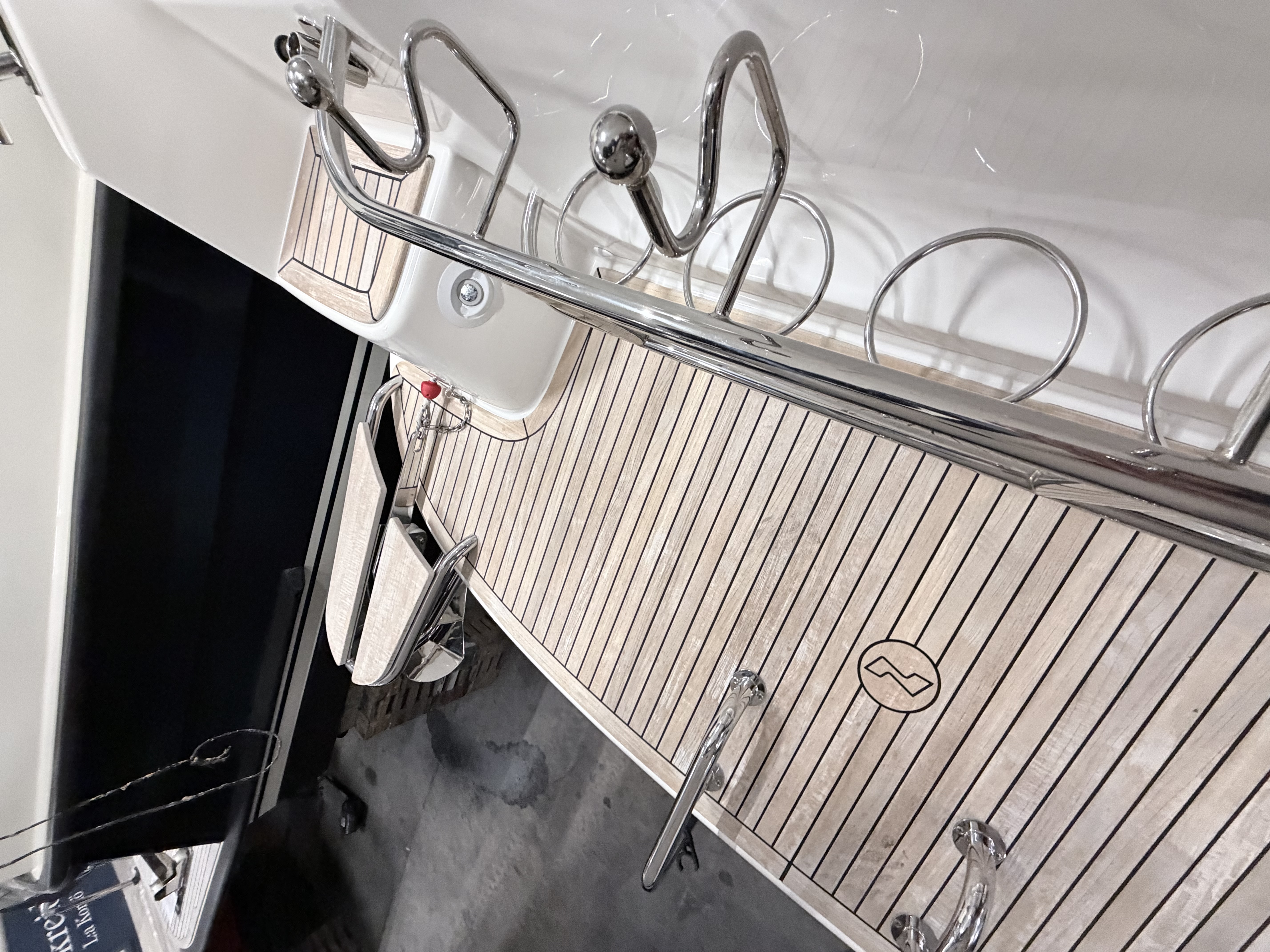 Teak badplattform, akterdäck, fördäck och styrbords sida