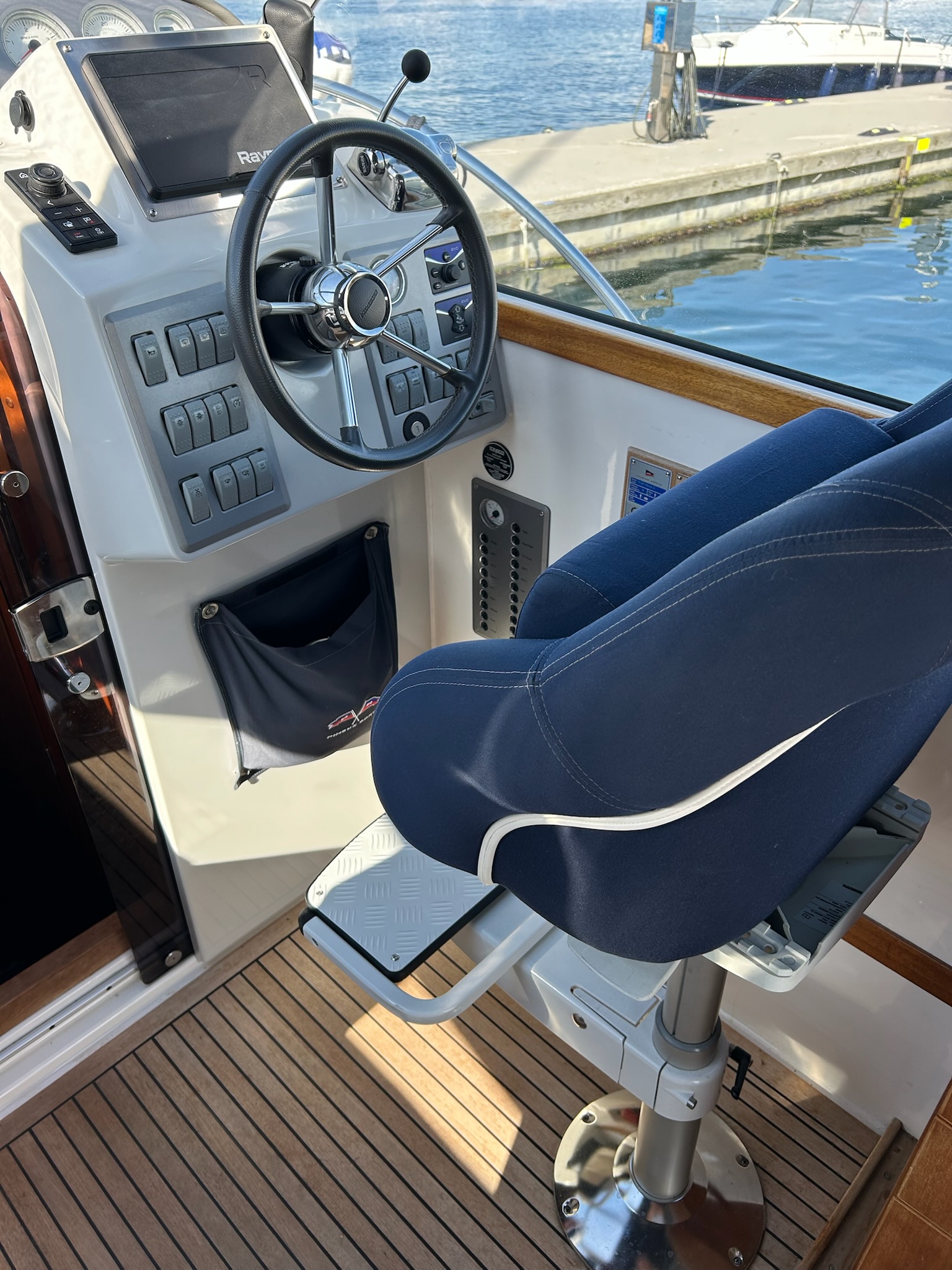 En båt som är både praktisk, rolig och snygg. Flexibel i användandet med variationen av badbåt, bobåt eller bara cruisa så är det en båt som verkligen är gjord för att användas. Två rejäla sovhytter med plats för 4 personer samt wc och dusch. Dusch med varmvatten även på akterdäck. Värmar som gör att båten går att använda både tidigt och sent på säsongen. Med Volvo Pentas starka och trygga D6:a så har den en turboladdad kraft som gör båten både snabb, stark och hanterbar med en relativt låg dieselförbrukning. Mycket bytt och uppgraderat senaste året så som ny kyl & spis, ny gps/plotter, nya batterier, ny blandare i badrummet, ny vattenpump, landström med Victronladdare, flera nya fönster i kapellet m.m. Drevet renoverat för 70.000 kr med garanti från Wahlborgs i Göteborg. Fullservad. Få ägare och i väldigt fint skick.