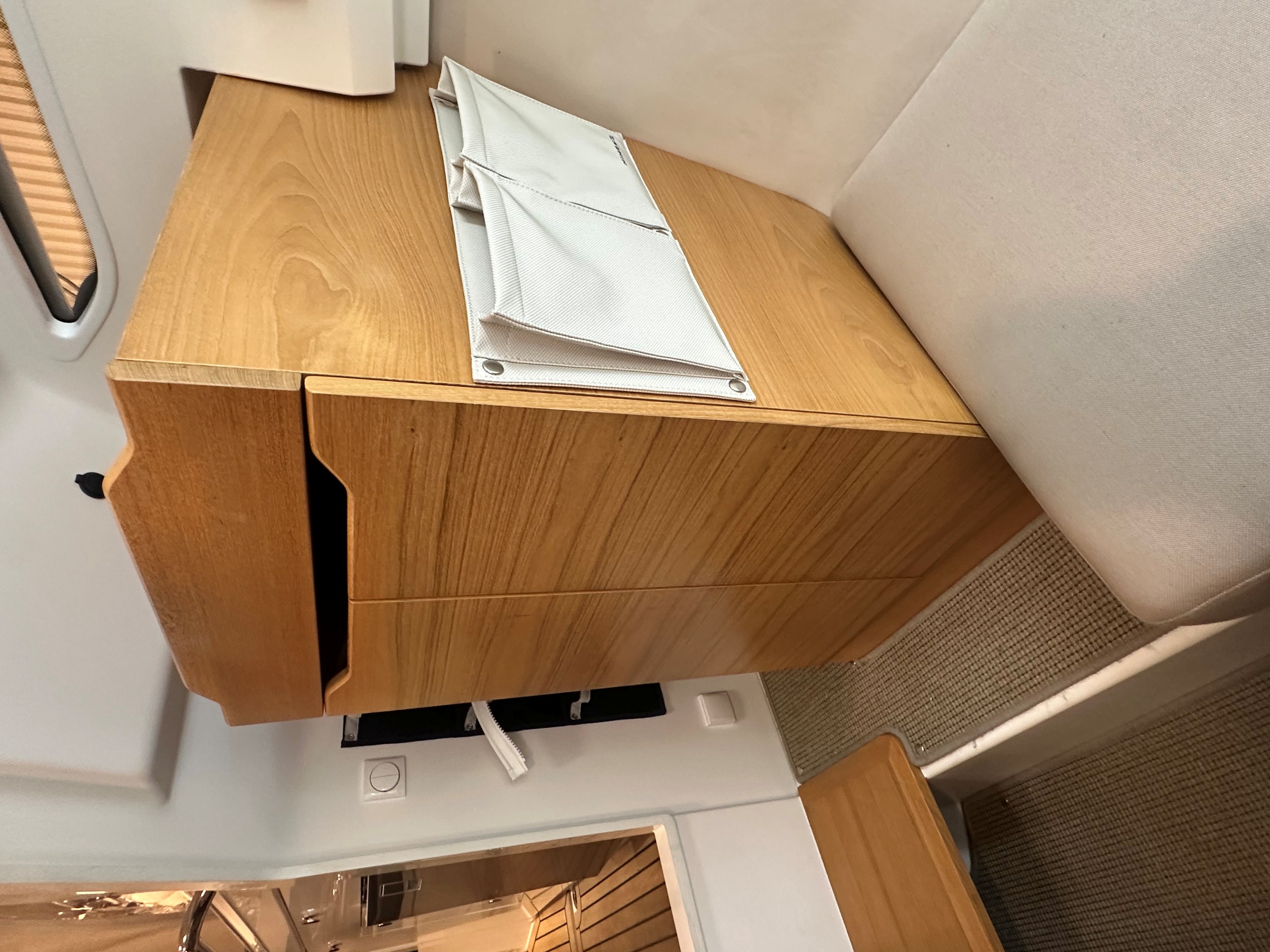 Standard Bogpropeller Sleipner SE40, Trimplan Zipwake 450, Corian skiva i pentry, Färskvattensystem, Servis 6p, Dusch akterdäck, Dynor Cockpit inkl prynadskuddar, Dynor förpik Beige, Plotter Simrad GO9, Matta i förpik, Leverans till Långedrag, Priser Sek inkl 25 % moms