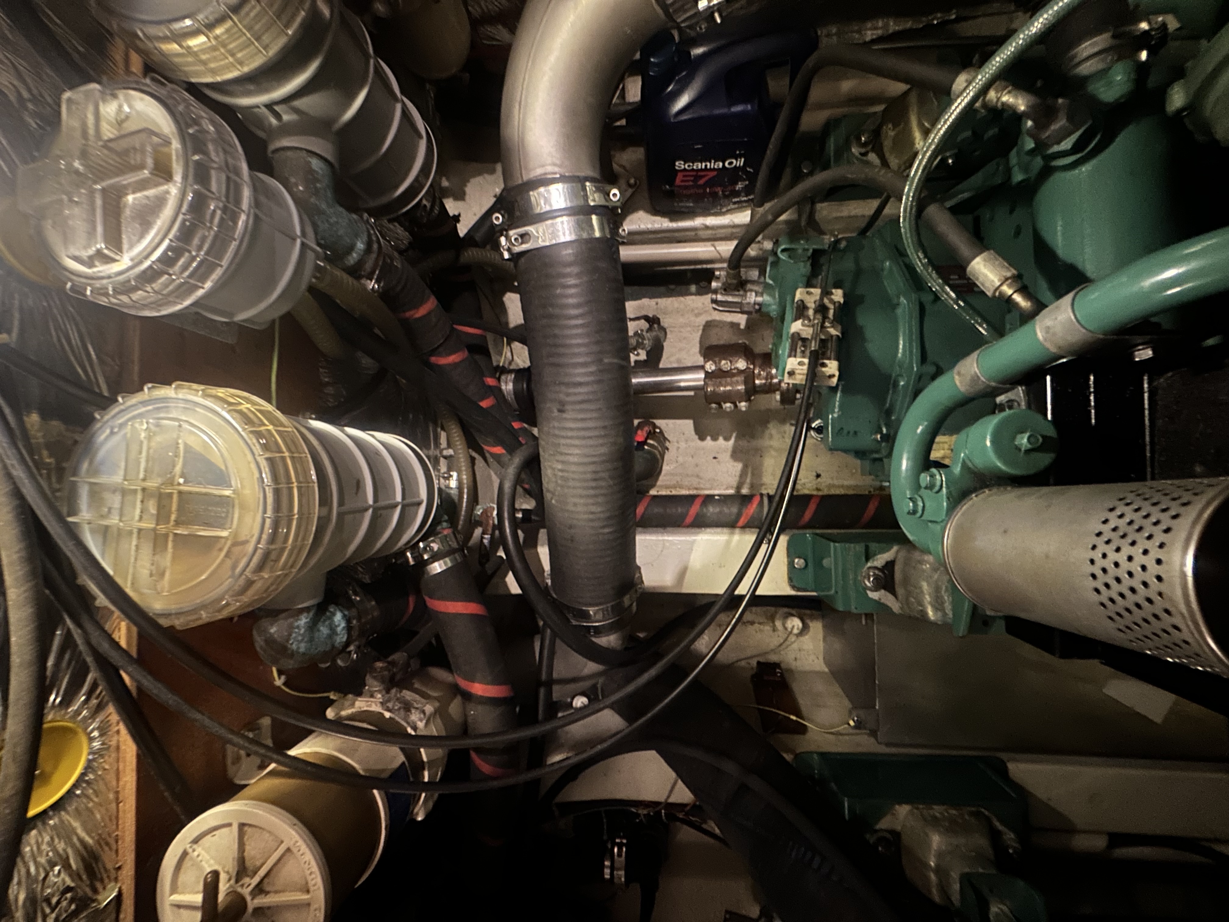 Bränsletankar: ca. 2 x 500 lit. – Vattentankar: 2 x 200 lit. Motorer: 2 x Volvo Penta TAMD 63P(2x 261 kW/ 355 ahk, motornummer 2061114049, 2061114048, diesel Gångtid: ca. 1435 timmar, Båten ligger i Skåne i varmhall