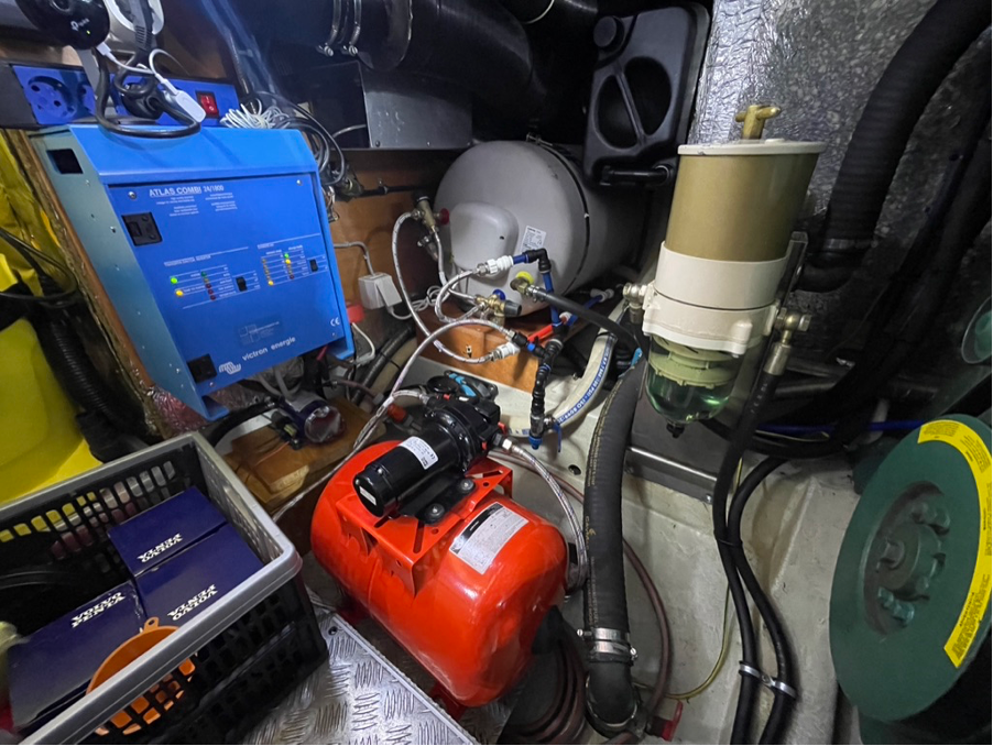 Stor uppsättning reservfilter, pumpar mm i kölsvinet.