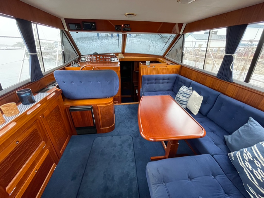 Teakbord samt två vikstolar förvaras under flybridge konsolen.