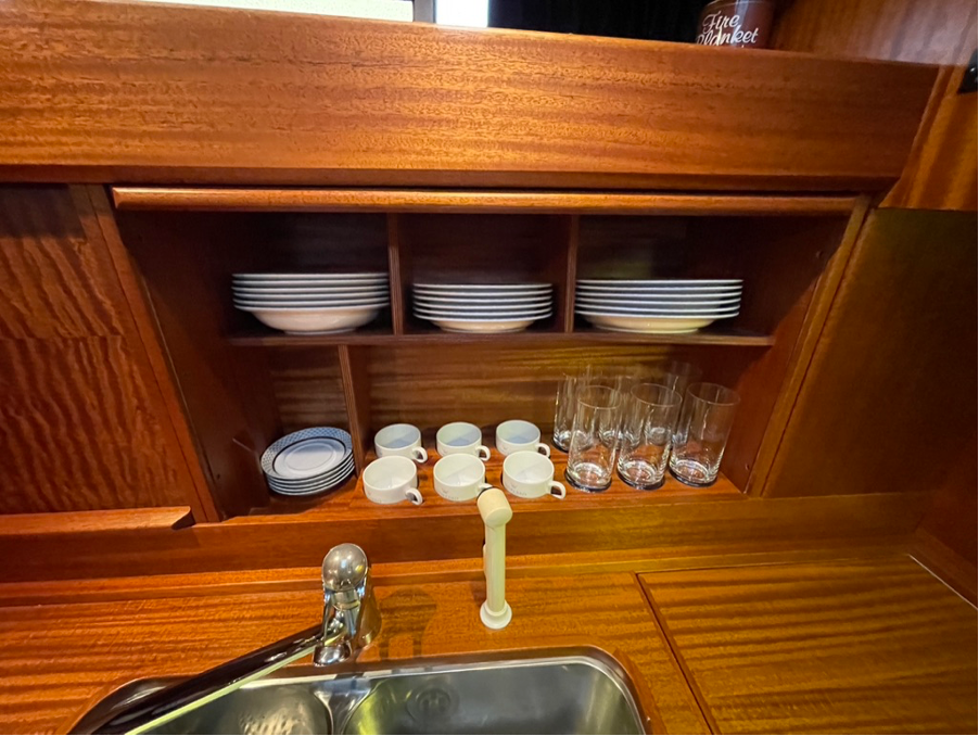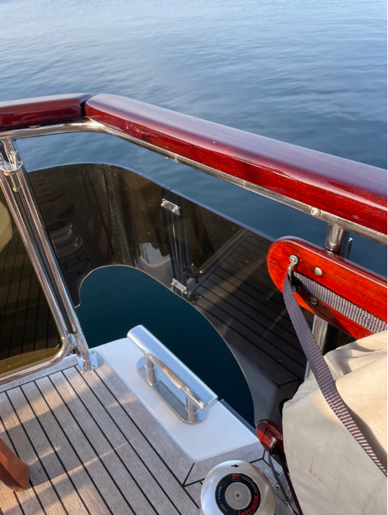 Mahogny reling, montageryggar för bord och stolar, flaggstång och båtshakar lackerade med 13 lager 2-komponentslack samt 3 lager bilklarlack, 2023.