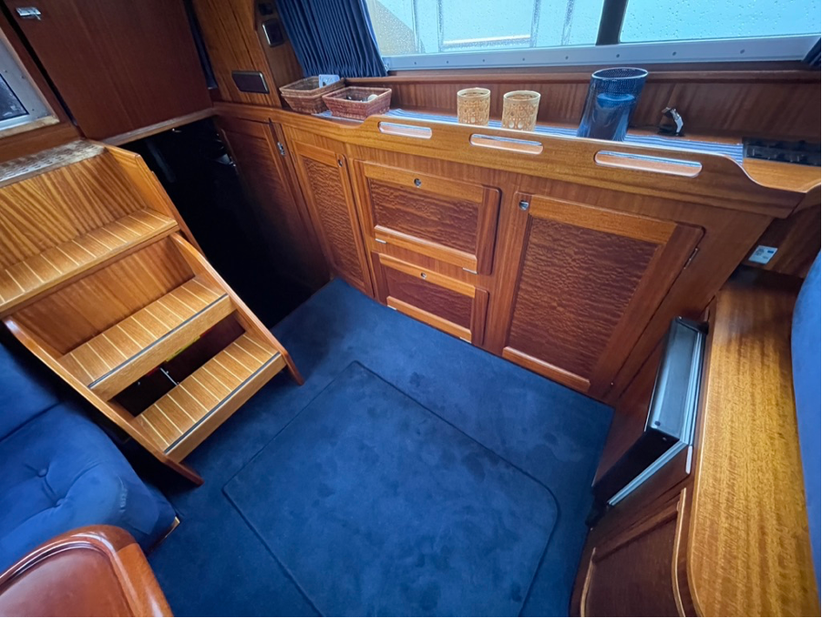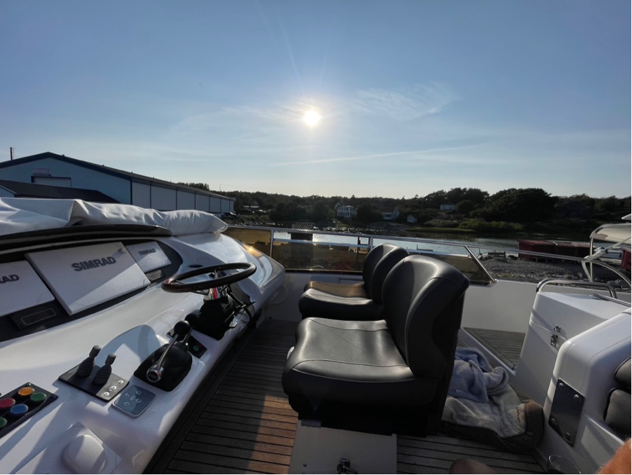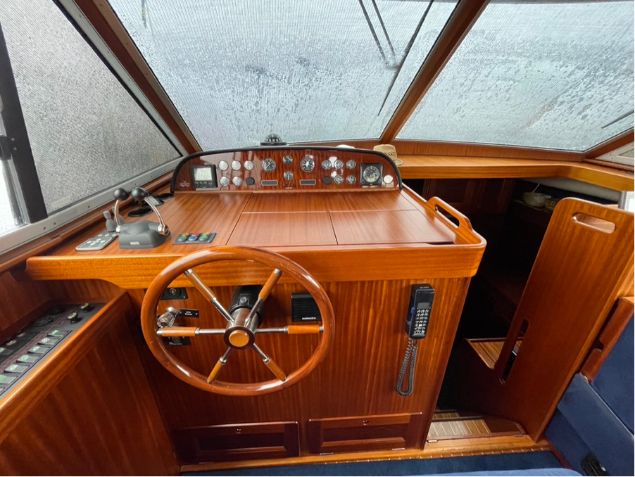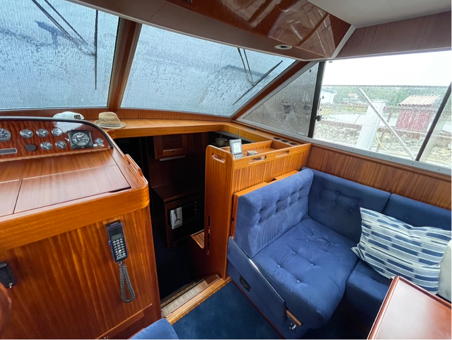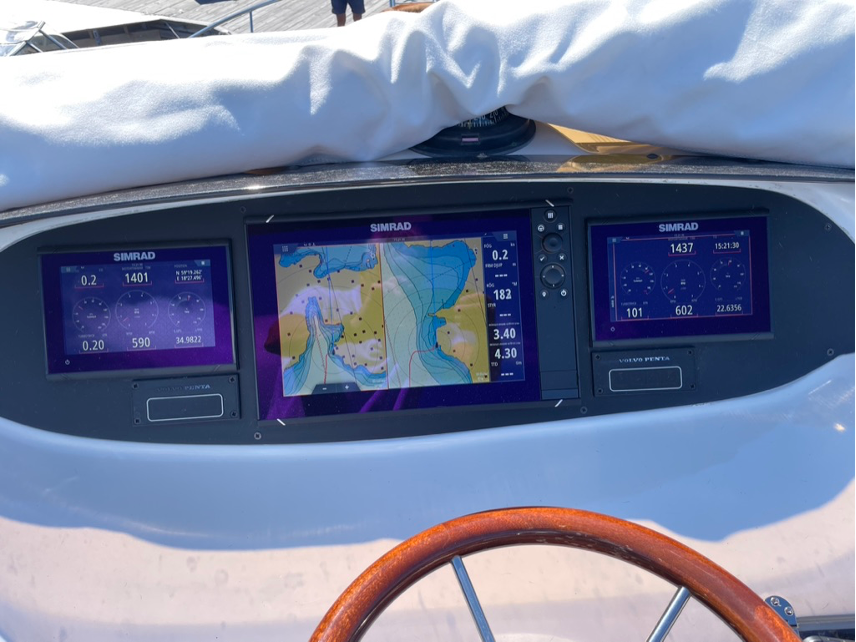 Moderniserad instrumentpanel i svart med försänkta Simrad NSS Evo03 skärm för navigation samt två Simrad skärmar som visar motordata. Fällbar ratt. Kontroller för bog och häckpropeller. Mente Marine trimplansautomatik.