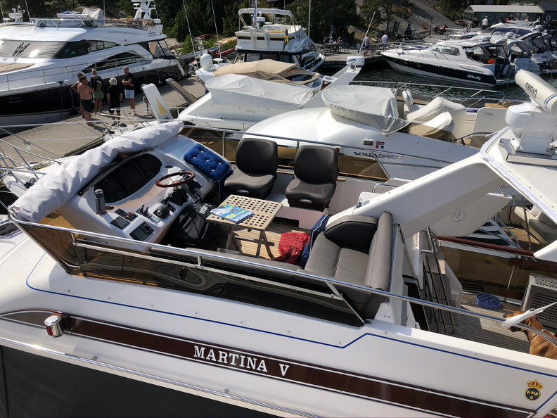 Riktigt tjockt mörkt plexiglas runt akterdäck och flybridge.