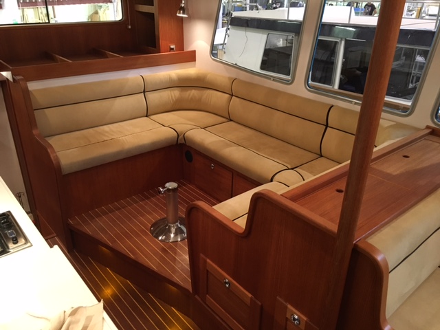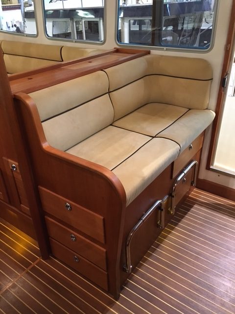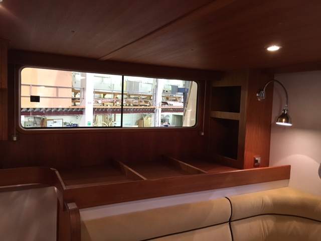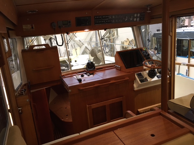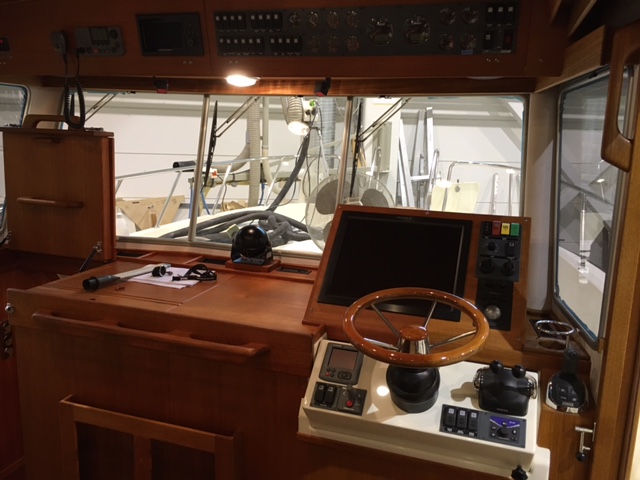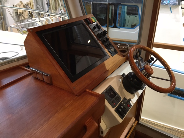 – Vinklad teaklåda för inbyggnad av plotter framför ratt