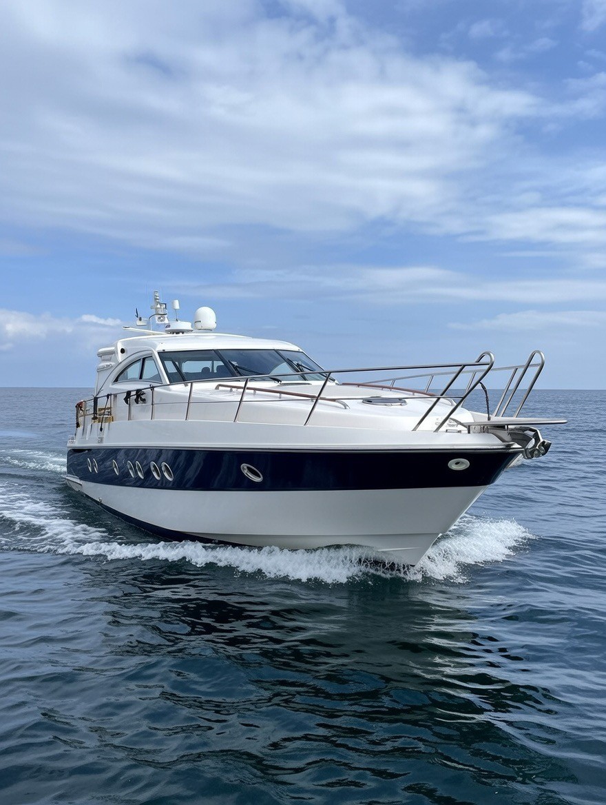 Skrov: Glasfiber – Motortyp: Diesel – Motor model: 2 x Volvo Penta D12